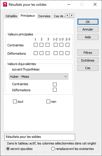 Les valeurs réduites sont indiquées suivant l'hypothèse choisie. La liste des hypothèses est disponible dans la partie inférieure de la boîte de dialogue. A l'heure actuelle, deux hypothèses sont accessibles :
