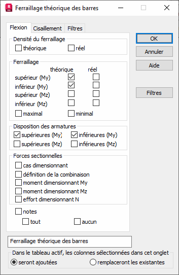 Vous pouvez sélectionner les grandeurs dont les valeurs seront affichées dans le tableau des résultats pour l'armature théorique des barres composant la structure.