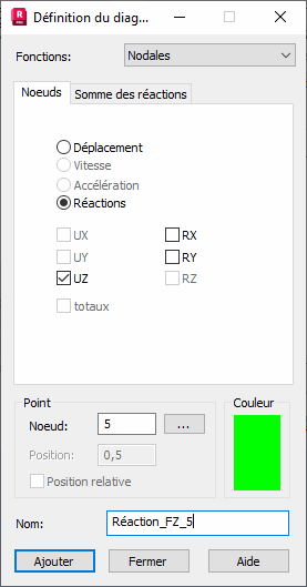 La boîte de dialogue Définition du diagramme sert à définir les diagrammes des grandeurs calculées lors des analyses avancées (analyse non linéaire, temporelle, analyse Push-over). La boîte de dialogue s’ouvre après un clic sur Ajouter ou Modifier dans la boîte de dialogue Analyses avancées.