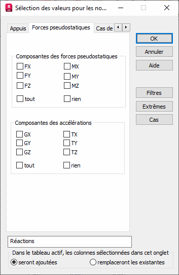 Sélectionnez l’onglet Forces pseudostatiques dans la boîte de dialogue Sélection des valeurs pour les nœuds afin de sélectionner les composants d’effort pseudostatique pour la présentation.