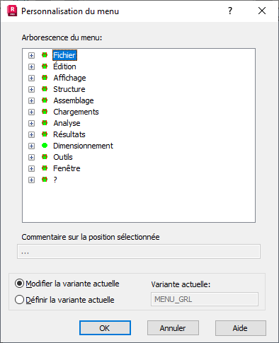 Dans cette boîte de dialogue, vous pouvez modifier la variante actuelle du menu ou en définir une nouvelle.
