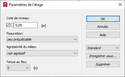 La boîte de dialogue Paramètres de l'étage permet de définir les paramètres caractéristiques d'un étage conformément à la norme française (BAEL).