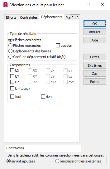 Dans la zone Déplacements des barres, vous pouvez sélectionner les informations suivantes : UX, UY et UZ. De plus, vous pouvez sélectionner le déplacement total qui est le déplacement résultant dans le repère local et dont la valeur est égale à la racine de la somme des carrés des déplacements UX, UY, UZ.