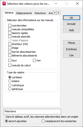 Le tableau peut présenter la liste des nœuds de calcul et les informations sur les barres et les éléments aboutissant au nœud :