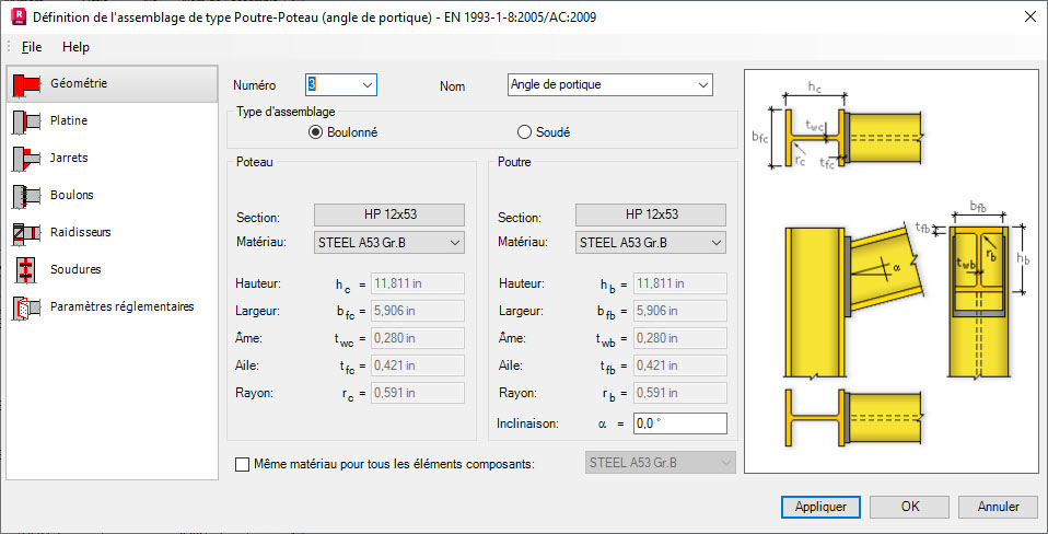 La partie centrale de la boîte de dialogue présente les paramètres de la géométrie et des matériaux du poteau acier et de la poutre acier pour lesquels l'assemblage est créé.