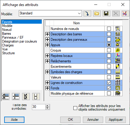 L'affichage des attributs permet de sélectionner la structure des attributs à présenter à l'écran. La boîte de dialogue s'affiche uniquement si le composant .NET est installé.