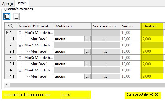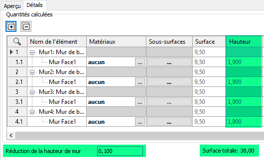 Remarque : Cet outil est disponible uniquement pour les surfaces de mur. La réduction de hauteur de mur est désactivée pour les autres quantités par pièce.