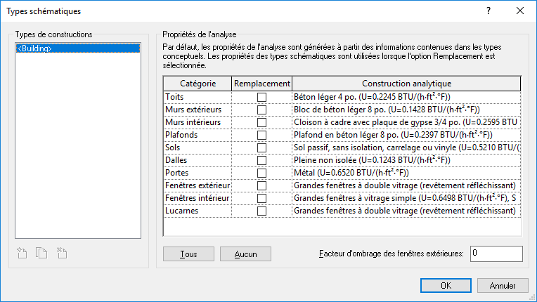 La prochaine fois que vous effectuerez une analyse d’énergie, les propriétés thermiques pour le type schématique (constructions analytiques) spécifié seront utilisées pour ces catégories d’éléments.