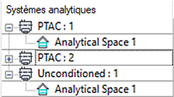 L’espace nommé Espace analytique 1 se trouve à la fois dans un équipement de zone de type Non climatisé et dans un équipement de zone de type Climatiseur terminal autonome. Cette configuration est incorrecte.