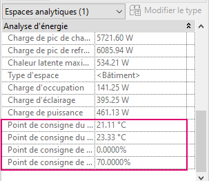 Une fois le modèle énergétique créé, les points de consigne dans les paramètres Type de bâtiment sont appliqués aux espaces analytiques et s’affichent en lecture seule dans la palette Propriétés.