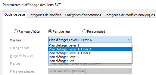 - Pour l'option Vue liée, sélectionnez la vue du modèle lié dont vous souhaitez utiliser les paramètres d'affichage pour le modèle lié de la vue d'hôte active.
