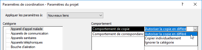 Avant ou lors de la copie d'appareils à partir d'un modèle lié vers un modèle MEP, spécifiez le comportement de copie de chaque catégorie d'appareils dans la boîte de dialogue Spécification des paramètres de coordination.