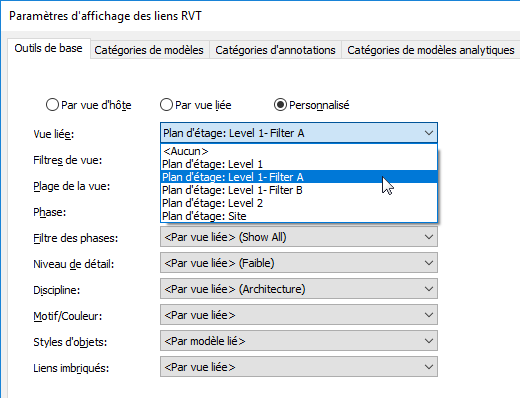 - Dans l’onglet Outils de base de la boîte de dialogue Paramètres d’affichage des liens RVT, effectuez les opérations suivantes :