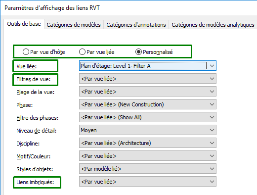 Pour contrôler l'utilisation des filtres pour des modèles liés dans une vue d'hôte, utilisez les paramètres de la boîte de dialogue Paramètres d'affichage des liens RVT.