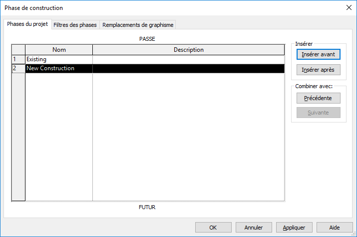 La boîte de dialogue Phase de construction s'ouvre avec l'onglet Phases du projet affiché. Par défaut, chaque projet possède des phases appelées Existante et Nouvelle construction.