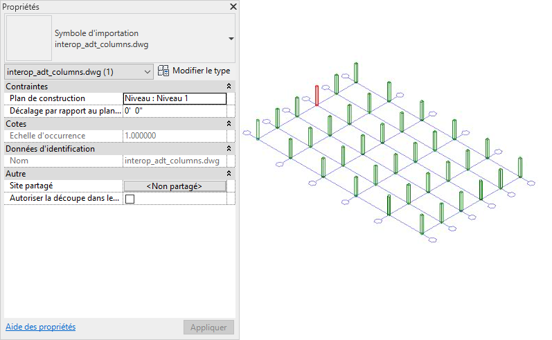 Poteaux Revit créés à partir de poteaux AutoCAD Architecture importés.