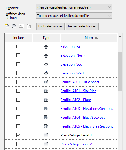 Lors de l'exportation d'un modèle vers différents formats, utilisez les outils de la boîte de dialogue Exporter pour sélectionner les vues et les feuilles à inclure. Enregistrez le jeu sélectionné pour le réutiliser ultérieurement.