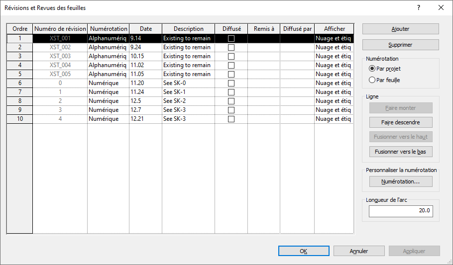 Revit offre une grande souplesse en termes d'affichage de l'ordre des révisions dans un projet. Pour effectuer le suivi des révisions, vous disposez des schémas de numérotation suivants :