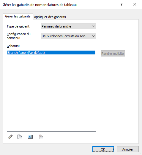 Vous pouvez utiliser la boîte de dialogue Gérer les gabarits de nomenclatures de tableaux pour modifier, dupliquer, supprimer et appliquer des gabarits de nomenclatures de tableaux. Vous pouvez également spécifier le gabarit par défaut.