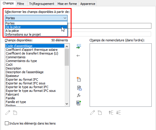 - Dans l'onglet Champs, sous la liste déroulante Sélectionner les champs disponibles à partir de, sélectionnez De la pièce ou A la pièce.
