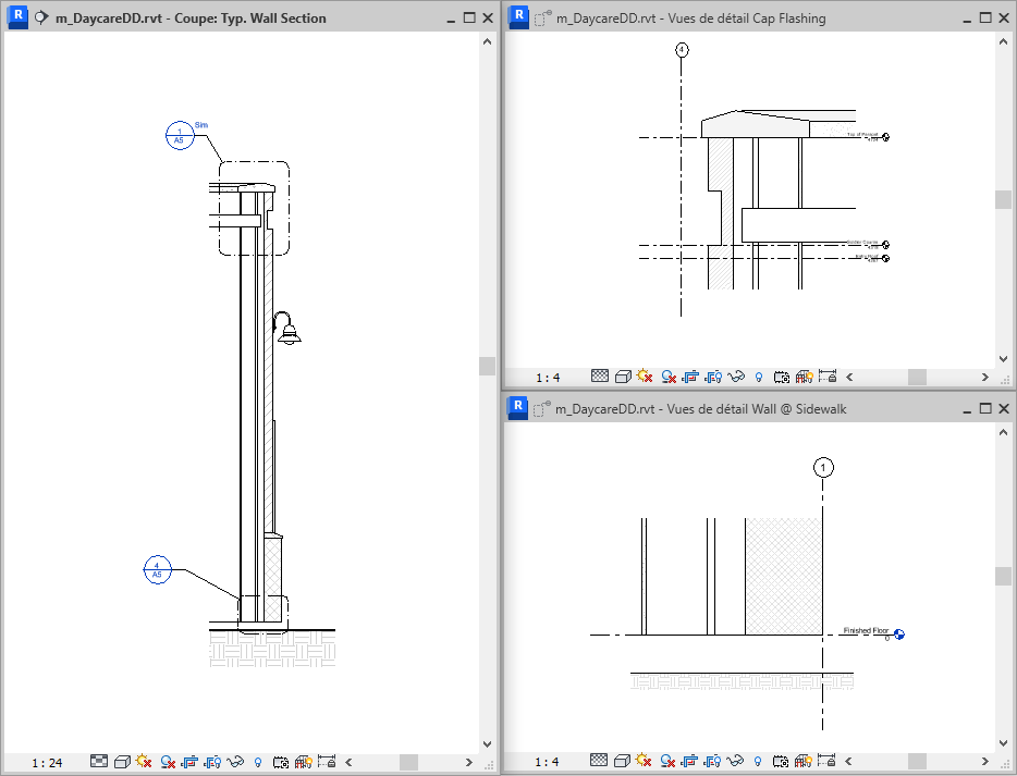 Vous pouvez ajouter un repère à une vue en plan, une vue de détail ou une vue d'élévation. Dans ces vues, l'étiquette de détail est liée à la vue de détail. La vue de détail présente une version agrandie d'une partie de la vue parente et fournit des informations ou des détails supplémentaires sur cette partie du modèle de bâtiment.