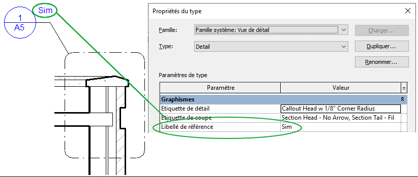 Vous pouvez modifier l'affichage du libellé de la référence dans l'étiquette de détail ou ajouter les numéros de feuille ou de détail de référencement au marqueur de détail. Pour ce faire, créez une famille de marqueurs de détails, puis ajoutez des libellés faisant appel à ces paramètres.