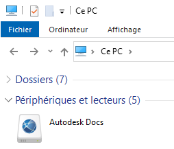 Une fois Desktop Connector installé, le lecteur connecté Autodesk Docs s'affiche. Ce lecteur connecté peut être utilisé pour lier ou ouvrir des types de fichiers pris en charge dans Revit.