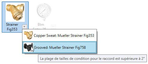 - Certains boutons de pièce ont une flèche qui vous permet de sélectionner des éléments à partir d'une liste d'éléments disponibles. Pour chaque élément, une info-bulle affiche la condition pour laquelle il sera utilisé.