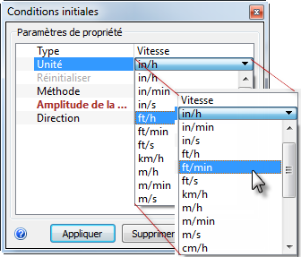 7. Dans la ligne Unité, sélectionnez pi3/min.