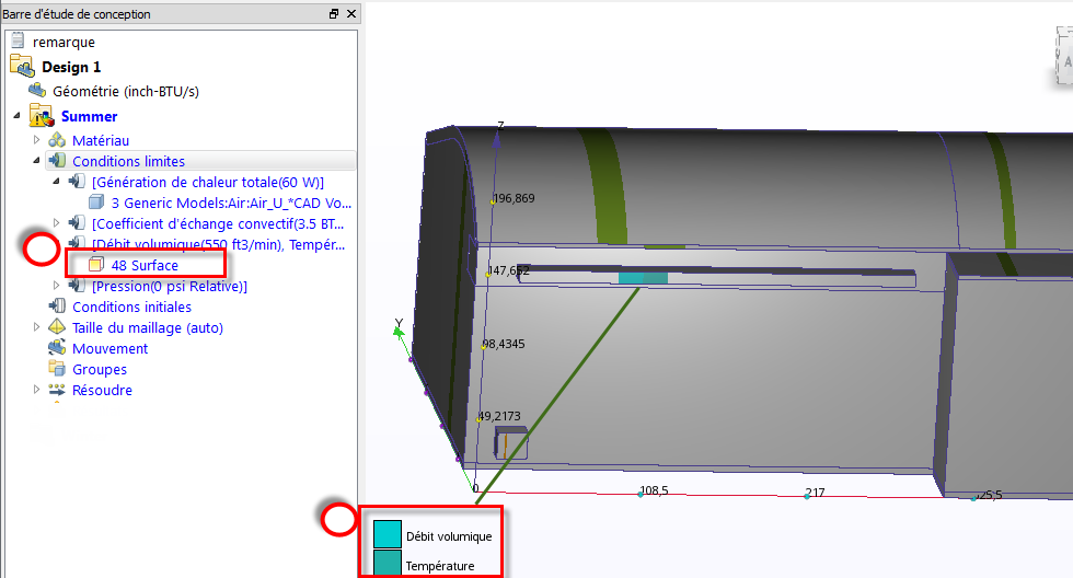 15. Pour vérifier que les deux conditions limites sont correctement affectées à l'alimentation, vérifiez la barre Étude de conception et les bandes de couleur sur la surface d'alimentation :
