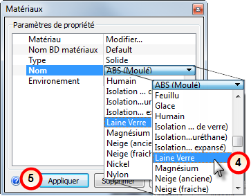 4. Dans le menu Nom, sélectionnez Laine de verre.