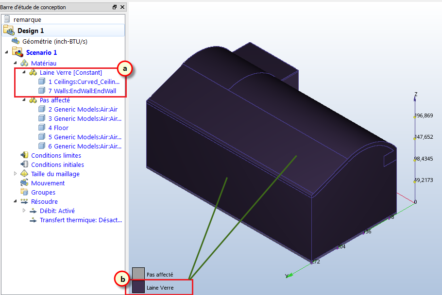 6. Pour vérifier que le matériau Laine de verre est affecté correctement, vérifiez la barre Étude de conception et la couleur des pièces :