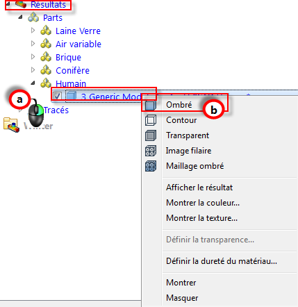 - a. Dans la branche Résultats de la barre Etude de conception, cliquez sur le nom de l'élément avec le bouton droit dans la branche de matériaux Humain.
