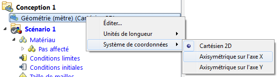 Cette analyse est axisymétrique autour de l'axe X. Nous allons modifier le système de coordonnées dans l'arbre de l'étude de conception.