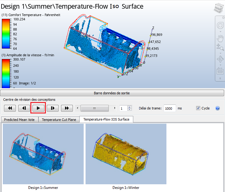 Dans l'étape précédente, vous avons regardé la température au milieu du hall et nous avons observé des différences importantes entre les scénarios d'hiver et d'été. Dans cette étape, nous allons utiliser l'image récapitulative d'une isosurface pour mieux comprendre l'interaction entre l'écoulement et la température.