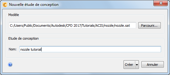 Dans la boîte de dialogue Gestionnaire de fichiers, accédez au dossier Utilisateurs\Public\Documents publics\Autodesk\CFD 2023\Didacticiels\<type de fichier>\buse.