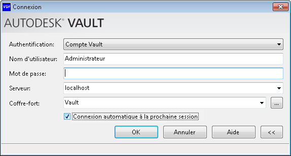 La boîte de dialogue de connexion permet à l'utilisateur d'effectuer une sélection à partir d'une liste des coffres-forts disponibles sur un serveur spécifique.