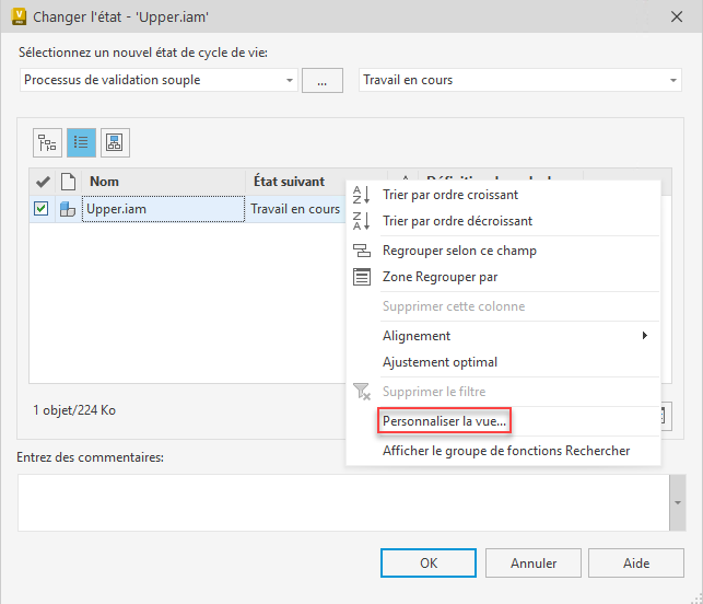Une fonctionnalité de personnalisation des vues a été ajoutée afin d’ajuster l’affichage des colonnes dans plusieurs boîtes de dialogue (Changer l’état, Changer la révision, Changer de catégorie, Prêt à emporter, Synchroniser les propriétés et Annuler l’extraction). L'optimisation des propriétés et la personnalisation de l'affichage permettent d'adapter considérablement la gestion des données à votre projet.