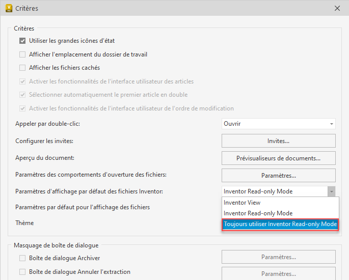 Une nouvelle option intitulée « Toujours utiliser Inventor Read-only Mode » a été ajoutée dans les options de Vault pour les paramètres d’affichage des fichiers Inventor. Cette option est toujours disponible, que le fichier DWF soit disponible ou non.