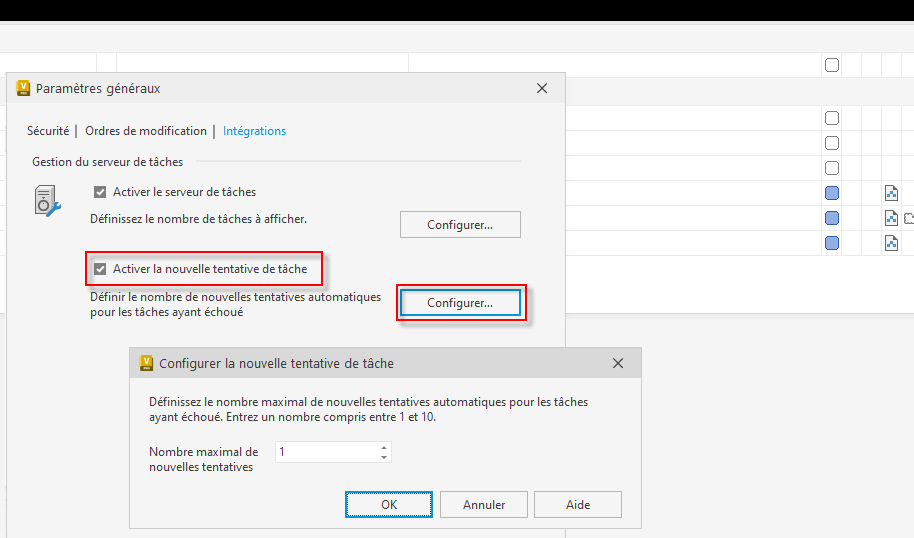 En tant qu’administrateur, vous pouvez désormais activer et définir de nouvelles tentatives automatiques pour les tâches ayant échoué. Vous pouvez définir le nombre maximal de nouvelles tentatives entre 1 et 10. Par défaut, le nombre maximal de nouvelles tentatives est défini sur 1. Le système revient à la tentative manuelle si la tâche échoue après le nombre de tentatives automatiques défini.