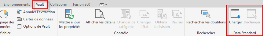 Dans Autodesk Inventor, utilisez le bouton Charger/Décharger du ruban Vault pour activer ou désactiver le complément Data Standard.