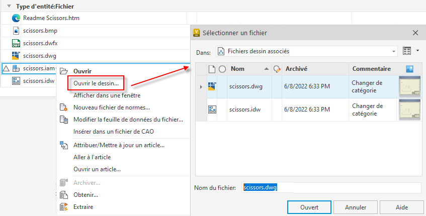 Dans le menu contextuel du fichier, utilisez la commande Ouvrir le dessin que vous venez d’ajouter pour ouvrir le fichier dessin associé à partir de Vault Client.