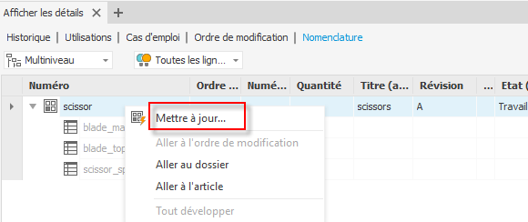 Utilisez la commande Mettre à jour du menu contextuel de l’onglet BOM dans le volet Afficher les détails pour mettre à jour la nomenclature de l’article. Avec cette amélioration, vous n’avez pas besoin de basculer vers l’onglet Utilisations ou l’article Vault Explorer pour obtenir la commande Attribuer/Mettre à jour.
