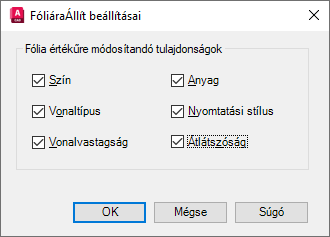 A kiválasztott objektumok nyomtatási stílusát Fóliára módosítja. Ez a lehetőség elnevezett nyomtatási stílussal rendelkező rajzokban használható. (SETBYLAYERMODE=16)