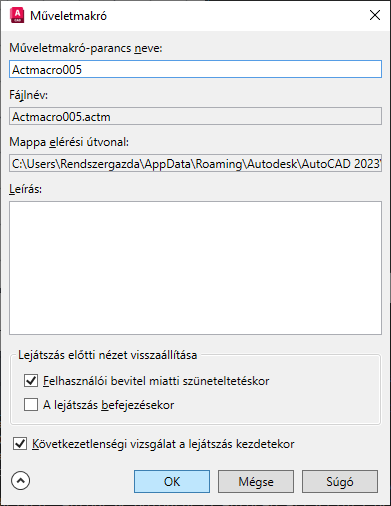 Az aktuális műveletmakró fájl tárolási helyét jeleníti meg.