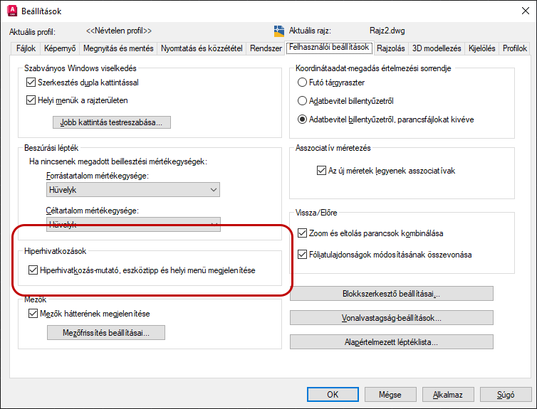 A Beállítások párbeszédpanel Felhasználói beállítások lapján engedélyezze a hiperhivatkozás adatainak megjelenítését.