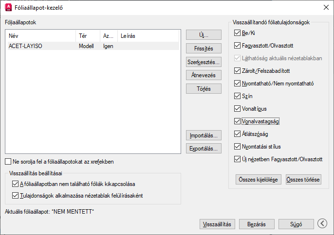 A kiválasztott fóliaállapotot a fóliatulajdonságok felülírásaként alkalmazza a program az aktuális elrendezési nézetablakra. Ez az opció akkor érhető el, ha aktuális elrendezés nézetablak esetén indítja el a Fóliaállapot-kezelőt.