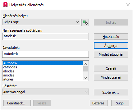 A helyesírás-ellenőrzést csak a kiválasztott egysoros szövegben, bekezdéses szövegben, méretszövegben, többszörösmutató-szövegben, blokkattribútum szövegében és xrefekben lévő szövegben hajtja végre.