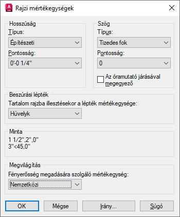 Megjelenít egy mintát az aktuális beállításokról az egységekhez és a szögekhez.