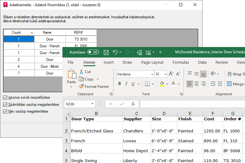 Az Excel számolótáblákban tárolt adatok összekapcsolhatók és egyesíthetők a kiemelt rajzadatokkal (objektumtulajdonság-adatokkal). A fenti példát folytatva tegyük fel, hogy a rajzban szereplő ajtókhoz további adatok (szállító és költség) állnak rendelkezésre egy Excel számolótáblában. Kiválasztja a számolótábla Szállító és Költség oszlopát, és egyesíti az adatkiemelés egyéb adataival.